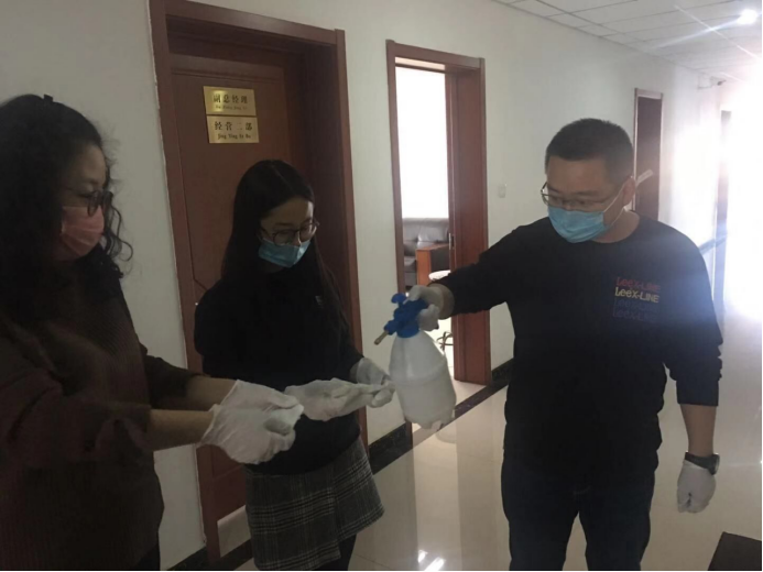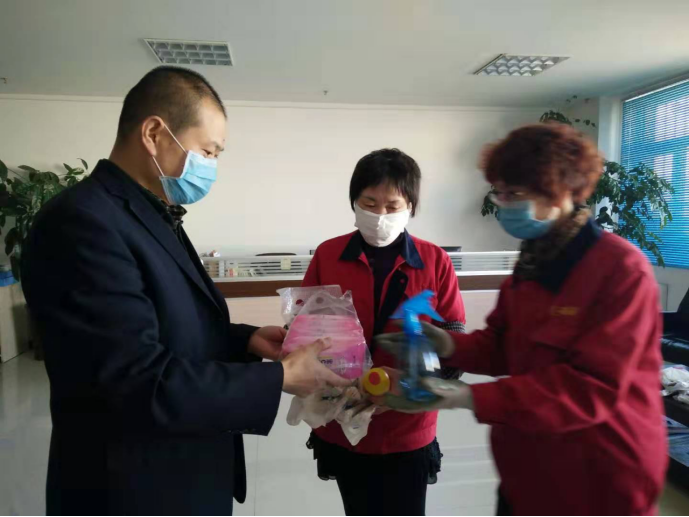 守護職工筑牢"安全防線":物產配送公司黨委通過配發(fā)酒精40公斤、84消毒液6瓶、消毒濕巾等防控器具,及時組織黨員指導職工進行防控工作,重點對宿舍、辦公室、值班室、洗手間門把手、辦公桌椅等進行噴灑消毒。