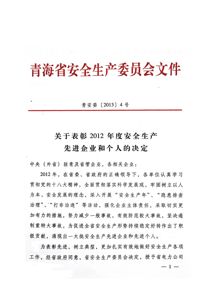 2012年,在省委、省政府的正確領(lǐng)導(dǎo)下,青海省物產(chǎn)集團(tuán)總公司認(rèn)真學(xué)習(xí)貫徹黨的十八大精神,全面貫徹落實(shí)科學(xué)發(fā)展觀,牢固樹立以人為本、安全發(fā)展的理念,深入開展"安全生產(chǎn)年"、"隱患排查治理"、"打非治違"等活動,為促進(jìn)全省安全生產(chǎn)形勢持續(xù)穩(wěn)定好轉(zhuǎn)做出了積極貢獻(xiàn)。為此,經(jīng)省政府同意,省安全生產(chǎn)委員會決定授予青海省物產(chǎn)集團(tuán)總公司"2012年度安全生產(chǎn)先進(jìn)企業(yè)"榮譽(yù)稱號。